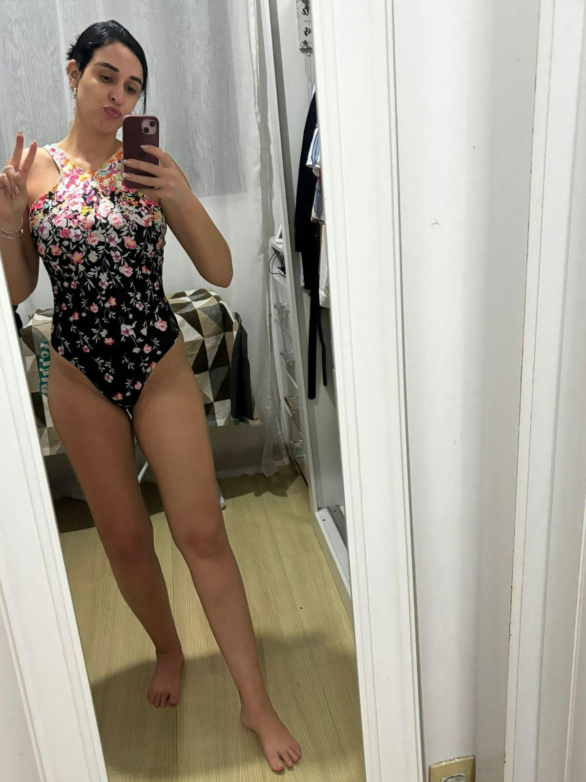 A modelo veste P, tem altura de 1,74 m, busto de 85 cm, cintura de 61 cm e quadril de 95 cm.